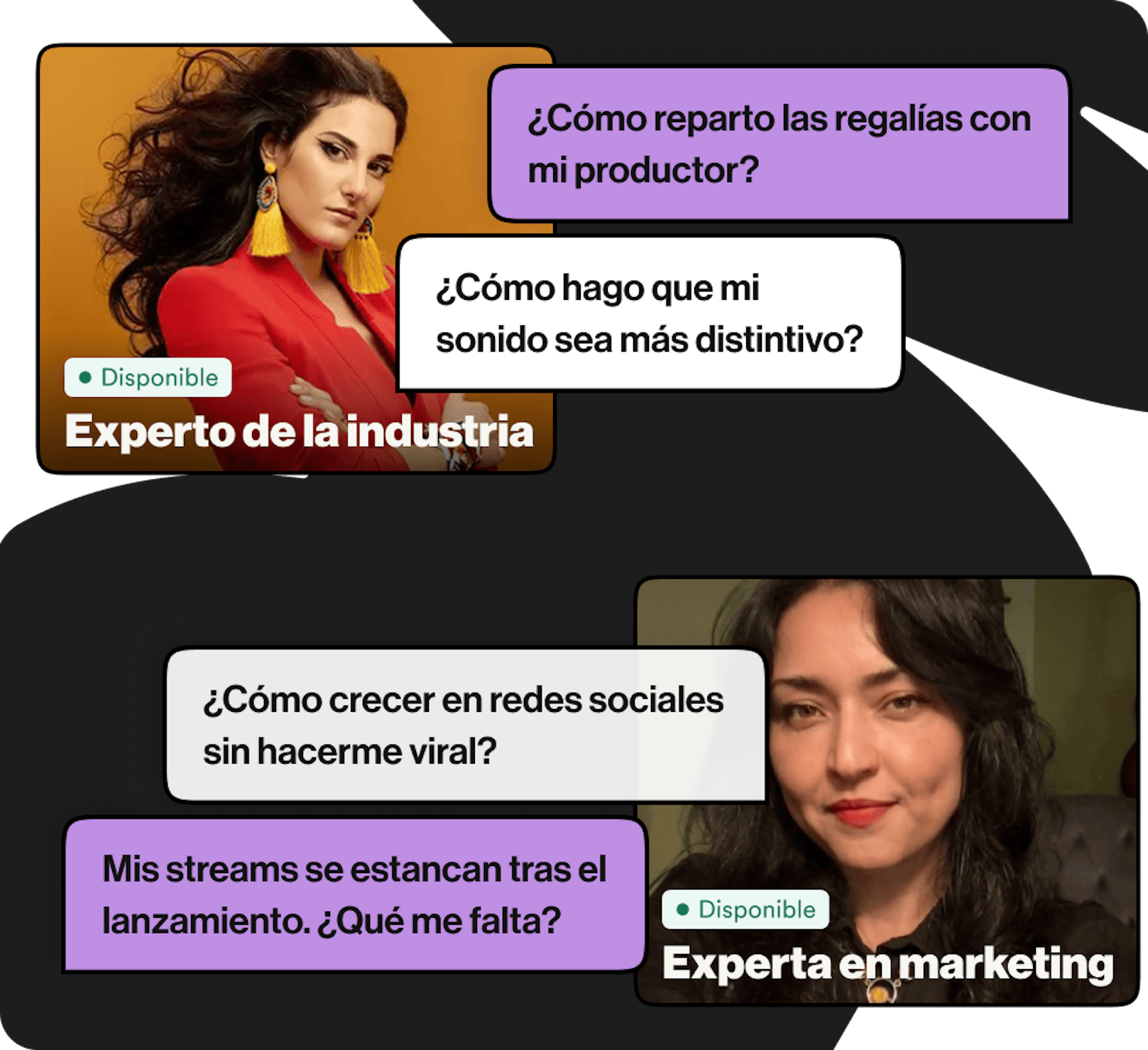 Desde una revisión en vídeo de 30 minutos de tu canción hasta una sesión completa de coaching 1:1, cada servicio es ofrecido por un experto de la industria musical y está diseñado totalmente para tu proyecto.