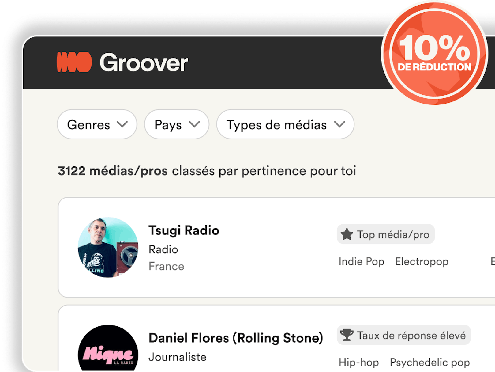 Groover connecte les artistes avec plus de 3 000 médias de musique, créateurs de playlists, labels et professionnels de la musique vérifiés. Choisis qui tu veux contacter, envoie ton morceau et reçois un retour écrit garanti ou récupère ton crédit.