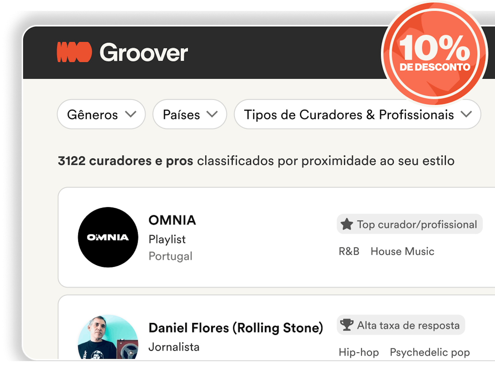Groover conecta artistas com mais de 3.000 curadores de música verificados, criadores de playlists, gravadoras e profissionais da indústria. Escolha quem quer contatar, envie sua música e receba um feedback garantido por escrito ou seu crédito de volta.